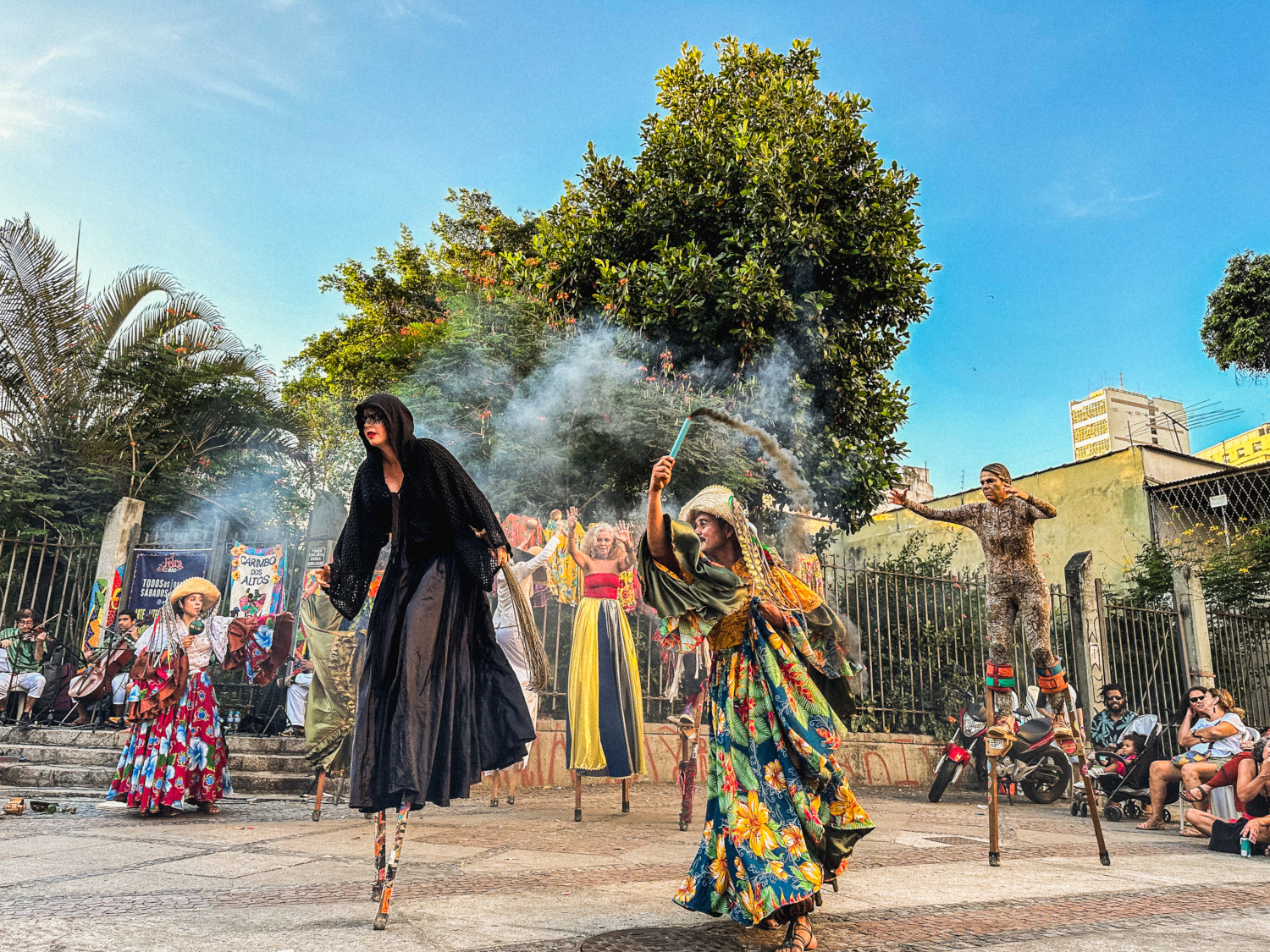 "Deu a Louca na Encantaria” é uma intervenção artística que une música ao vivo, pernas de pau e ritmos da Amazônia, celebrando a cultura afroindígena e ribeirinha. A experiência imersiva e itinerante transporta o público ao universo dos Encantados por meio do carimbó pau e corda.